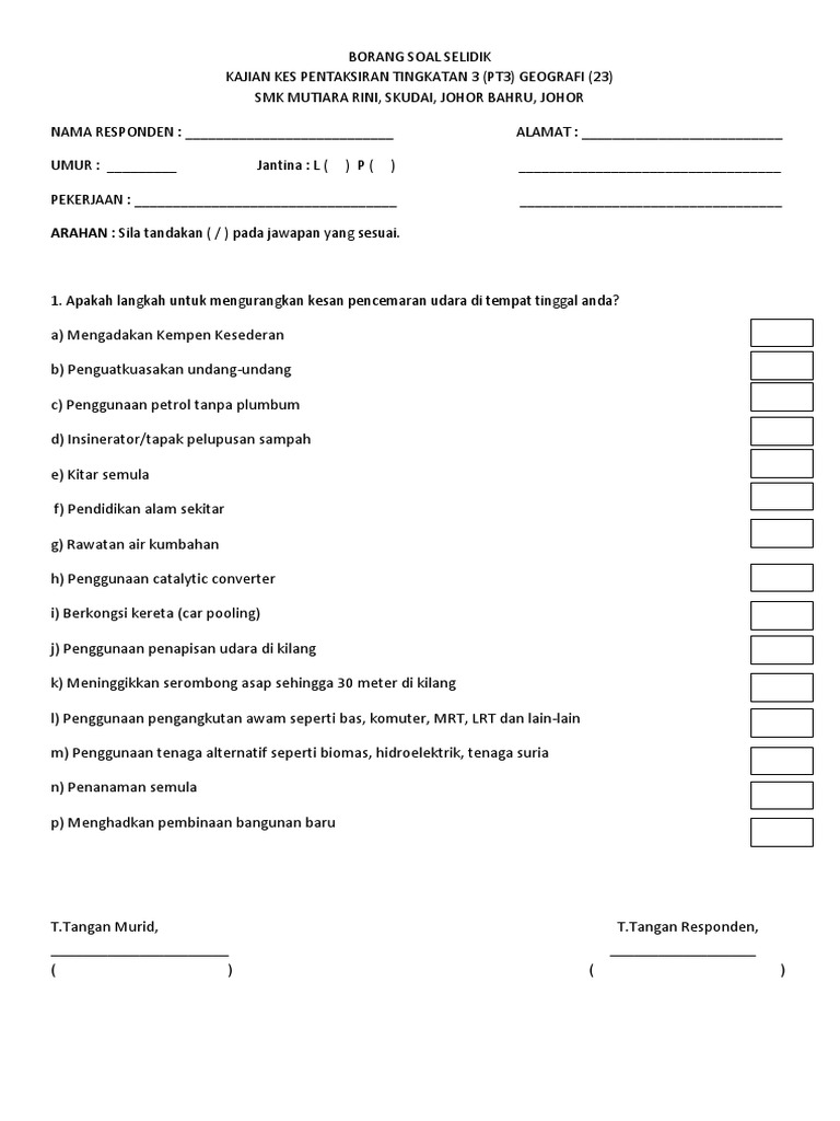Universiti pendidikan sultan idris shah fakulti perniagaan dan ekonomi program pendidikan ekonomi borang so… Contoh borang soal selidik geografi pt3 2022 tingkatan 3 : Borang soal selidik ini adalah untuk mendapatkan maklum balas daripada pelajar mengenai penawaran program rancangan pengajian jarak jauh (rpjj), . Contoh borang soal selidik:contoh borang soal selidik ini digunakan oleh calon pt3 untuk tugasan serta kerja kursus bagi subjek geografi .